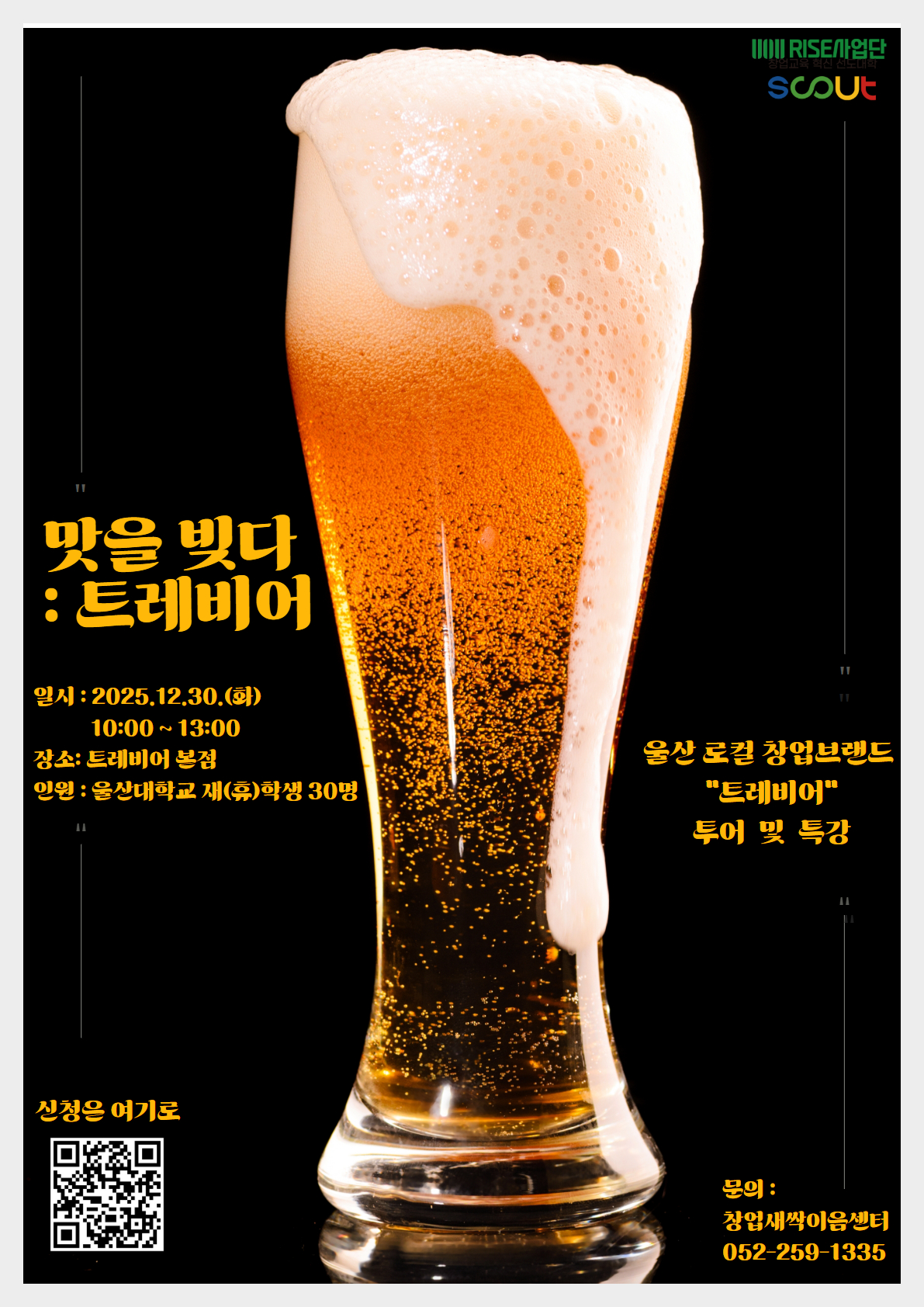 * 프로그램명: 청년X로컬인사이트 시리즈 - 맛을 빚다: 트레비어 * 행사 일시: 2025년 12월 30일(화) 오전 10시(2시간 30분 소요 예정) * 행사 내용: 울산 로컬 브랜드를 방문하여 브랜드 스토리 등 로컬 브랜드 특강 및 투어 진행 * 신청 링크: https://form.naver.com/response/jLRs4i8qBfy9bQd3_VR-iQ * 신청 인원: 선착순 30명! * 비고: 식사제공, 버스 단체 이동 예정 * 문의: RISE사업단 창업새싹이음센터 052-259-1335, 1055